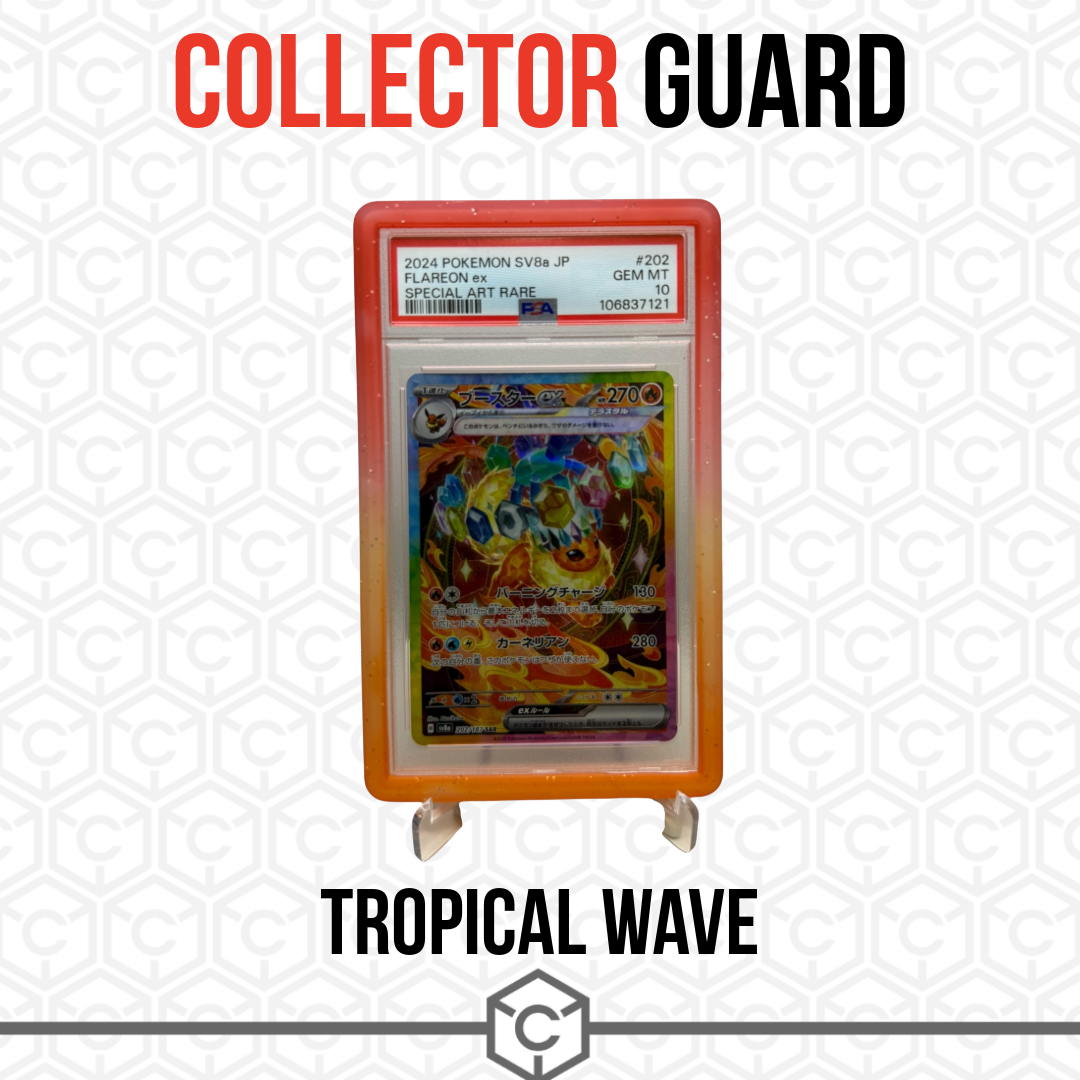 Tropical Wave,This stunning graded card protector features a dynamic color blend, starting with a brilliant, sun-drenched orange that smoothly fades into a passionate, deep red. Reminiscent of a hot sunset over the ocean, the Tropical Wave doesn't just shield your card from damage; it gives it a striking, high-energy aesthetic that is sure to stand out in your collection.
